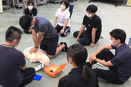 水泳学習が始まるのを前に、教職員が心臓マッサージの方法やAEDの使用法について確認しました。