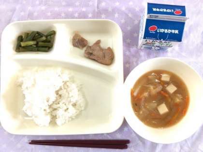 鶏肉のしょうゆバター焼き、とうふのみそ汁、さんどまめのごまあえ、ごはん、牛乳