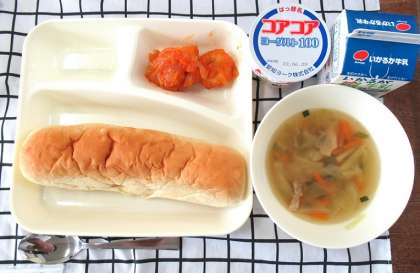 えびのチリソース、中華スープ、ヨーグルト、おさつパン、牛乳
