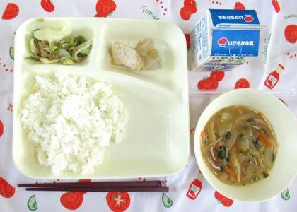 鶏肉のおろしじょうゆがけ、みそ汁、野菜いため、ごはん、牛乳