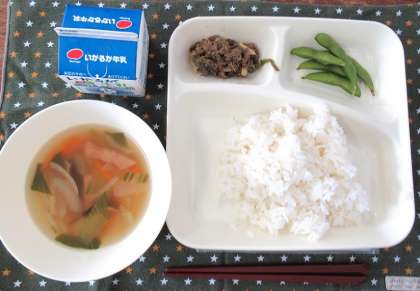 チンジャオニューロウスー、ハムと野菜の中華スープ、えだまめ、ごはん、牛乳