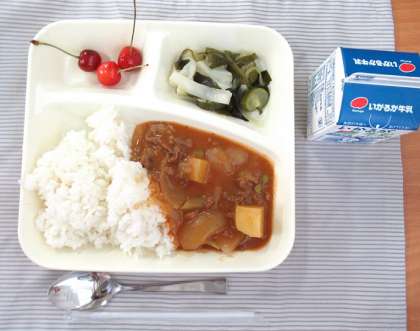 ハヤシライス、ミックス海そうのサラダ、さくらんぼ、牛乳