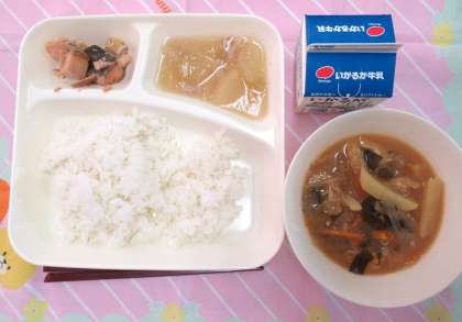 さけのつけ焼き、みそ汁、とうがんの煮もの、ごはん、牛乳