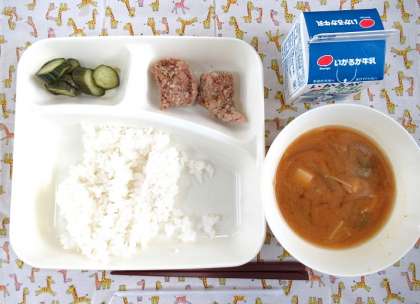 豚肉のたつたあげ、みそ汁、きゅうりの甘酢づけ、ごはん、牛乳