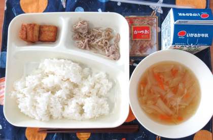 豚肉ともやしのいためもの、かつおぶし(袋)、すまし汁、あつあげのしょうがじょうゆかけ、ごはん、牛乳