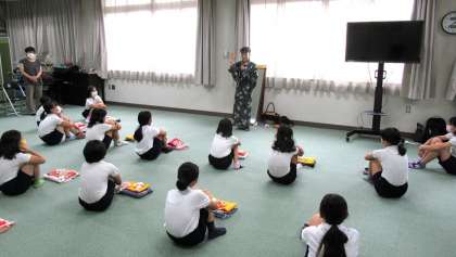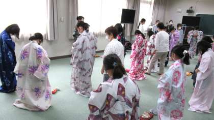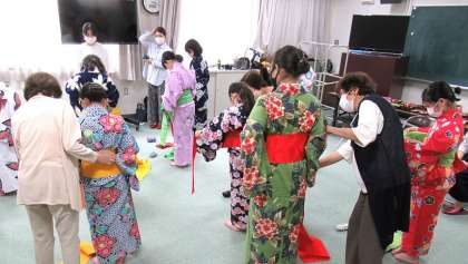 7月14日の放課後、5・6年生の希望者は、浴衣の着方を一通り習った後、NPO法人「メイク・イット」の皆さんに助けてもらいながら、実際に着てみました。