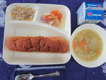 鶏肉とてぼ豆のスープ煮、じゃがいもとトマトのチーズ焼き、もやしとコーンのソテー、おさつパン、牛乳
