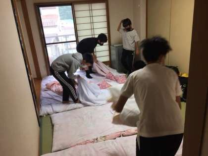 天気はくもり。協力して、寝具のかたづけ
