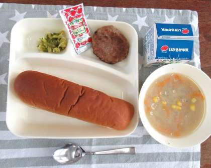 焼きハンバーグ、ケチャップ、豆乳スープ、キャベツとピーマンのカレーソテー、黒糖パン、牛乳