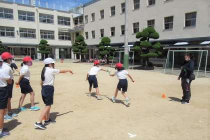 バトンパスの練習をしました。はじめての受け渡しでしたが、混乱せずにできました。