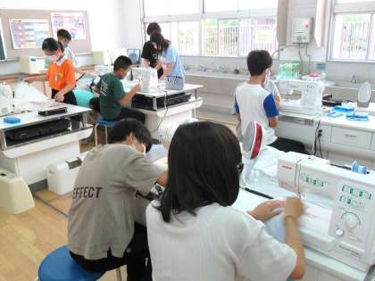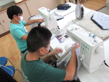 ミシンを使って、エプロンを縫います。はやく仕上げた人は、まだの人のお手伝いをします。