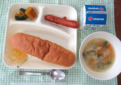 ウインナーのケチャップソース、スープ、焼きかぼちゃ、大型コッペパン、マーマレード、牛乳