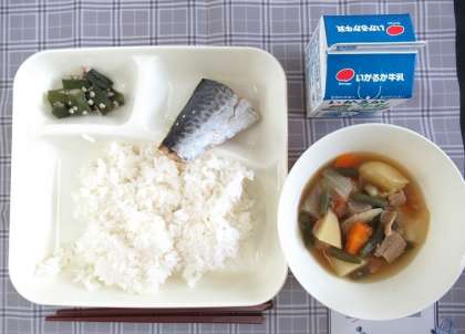 さごしの塩焼き、豚肉とじゃがいもの煮もの、オクラのいためもの、ごはん、牛乳