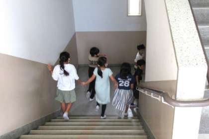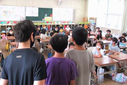 2〜5年生は、各自で集合場所へ行きますが、1年生は、6年生に教室まで向かいに来てもらい、連れていってもらいました。