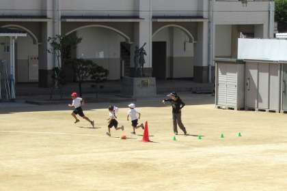 トラックを走ります。目印のコーンまでまっすぐに走り、勢いに乗ってカーブを曲がります。