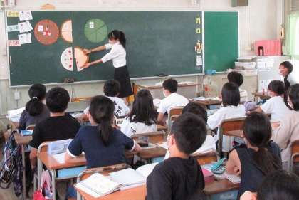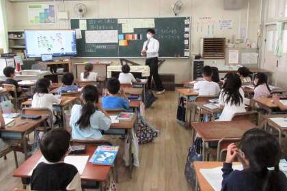教育実習生が、子どもたちに授業を行います。子どもたちの理解がすすむようにと、各自が工夫をしています。〔写真 左 2年生 右 5年生〕