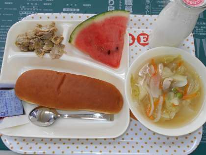給食調理員さんの巧みな技で切り分けられたすいか、おいしくいただきました。