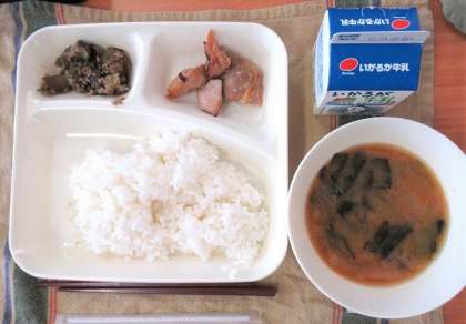 鶏肉のてり焼き、みそ汁、なすのそぼろいため、ごはん、牛乳