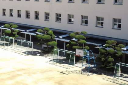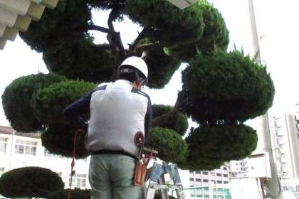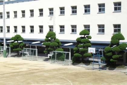 運動場のカイヅカイブキが、2階の窓の高さまで育ち、高所での作業が難しいこと、昨今、台風の勢いが強くなっていることを考慮して、本校の管理作業員と校園営繕園芸事務所の職員が合同で、カイヅカイブキの剪定を行いました。