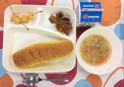なすのミートグラタン、鶏肉と野菜のスープ、さくらんぼ(缶)、パンプキンパン、牛乳