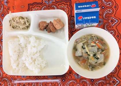 鶏肉のチリソース焼き、焼き豚とワンタンの皮スープ、切干しだいこんのごま辛みづけ、ごはん、牛乳〔本日は個別対応献立として、調理の最後に「ワンタンの皮」を加える前に、取り分けた「ワンタンの除去食」も提供しました。〕
