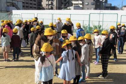 1〜6年生の縦割り班で、出席番号順に並ぶゲームをしました。6年生は、班のメンバーをリードします。
