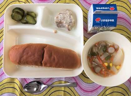 かつおのマリネ焼き【ノンエッグドレッシング】、ウインナーとじゃがいものスープ、きゅうりのサラダ、黒糖パン、牛乳