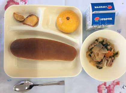 豚肉といかの中華煮、大学いも、みかん、黒糖パン、牛乳