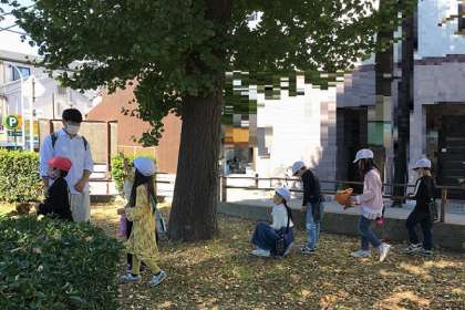 公園で、「秋」を見つけました。どんぐりは見つかりませんでしたが、銀杏の実がありました。落ち葉を集めました。