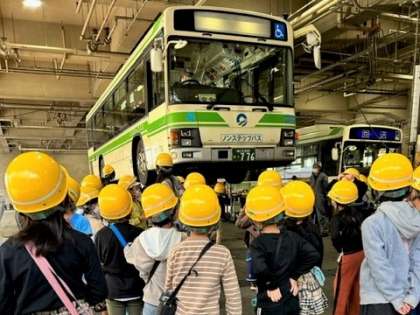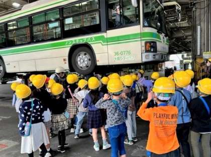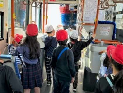 子どもたちは、バスに乗せたまま、洗車機をくぐりました。大きなブラシがバスを洗うのをバスの中から見ました。バスの下側も見学しました。とても貴重な体験をしました。