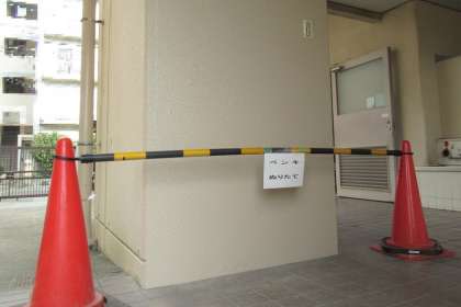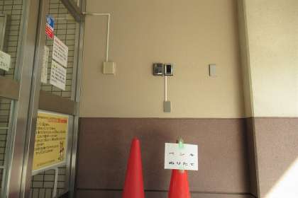 管理作業員が、汚れや痛みが目立つ玄関の側面と給食室前柱の塗装を行いました。来校者が、まず目にするインターホンのある壁をきれいにしてもらいました。