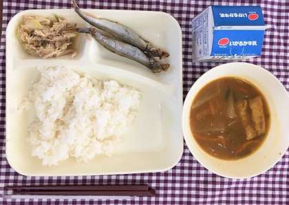 焼きししゃも、和風カレー汁、まいたけとキャベツのいためもの、ごはん、牛乳