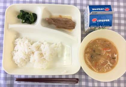 なまりぶしのしょうが煮、じゃがいものみそ汁、ほうれんそうのおひたし、ごはん、牛乳