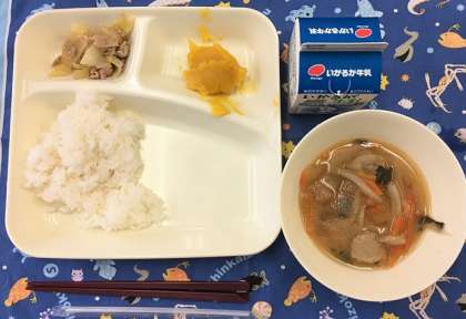 豚肉と野菜のいためもの、いわしのつみれ汁、かぼちゃういろう、ごはん、牛乳
