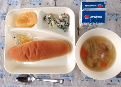 ほうれんそうのグラタン、スープ煮、白桃(缶)、マーマレード、大型コッペパン、牛乳