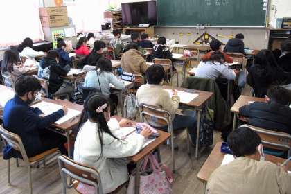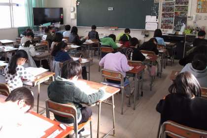 他校と同様、本校の3年〜6年の児童も、国語・社会のテストに取り組みました。