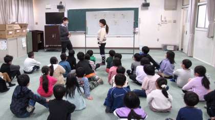 C-NET(英語が母語)の先生と一緒に、英語であいさつする練習をしました。興味を持って、活き活きと取り組んでいました。