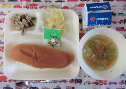 豚肉と野菜のソテー、スープ、スイートポテト、ソフトマーガリン、大型コッペパン、牛乳