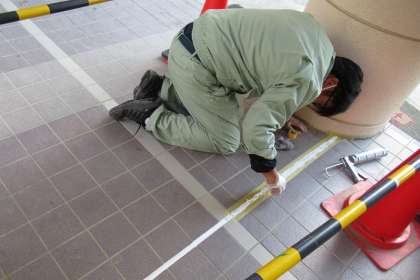 管理作業員さんがタイルとタイルの継ぎ目を埋めました。子どもたちの事故やケガにつながる箇所がないか、常に気を配り、見つけたらすぐに対処しています。