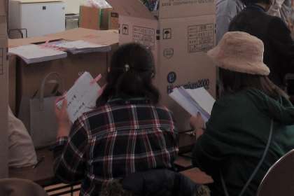 子どもたちが、描いた「ぬり絵」「まちがい探し」「線つなぎ」等の絵が抽選用紙になり、「ふれあい賞」「ふれあい大賞」が選ばれました。参加賞もあるので、全員が景品を手にしました。