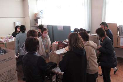 従来の取組はできないが、「子どもたちの笑顔が見たい」との想いから、給食時間に、ミーティングルーム(PTAの活動場所)と各教室をオンラインで結び、素敵な景品が当たる抽選会を行いました。〔写真:PTAのみなさんによる景品の仕分けや子どもたちの絵の確認作業の様子〕