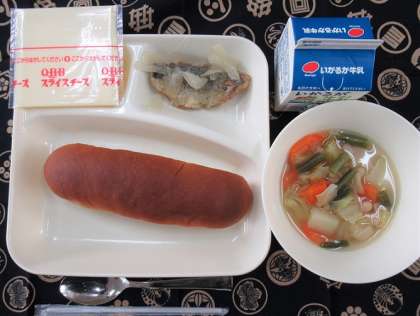 あじのレモンマリネ、てぼ豆のスープ煮、スライスチーズ、黒糖パン、牛乳