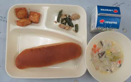 はくさいのクリーム煮、あつあげのごまじょうゆかけ、豚肉とさんどまめのオイスターソースいため、黒糖パン、牛乳
