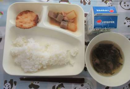 鶏肉の出手(どて)焼き風、はりはり汁、れんこんのフライ大阪ソース味、ごはん、牛乳