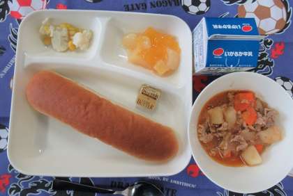 豚肉と野菜のケチャップ煮、カリフラワーのピクルス、フルーツゼリー、バター、コッペパン、牛乳