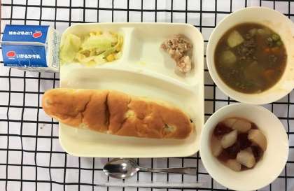 フライドチキン、カレーシチュー〔米粉〕、キャベツとコーンのサラダ、フルーツゼリー、おさつパン、牛乳