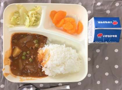 ハヤシライス、キャベツのバジル風味サラダ、みかん(缶)、牛乳