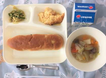 ポトフ、カレーソテー、焼きプリン、おさつパン、牛乳
