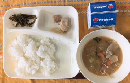 まぐろの甘辛焼き、豚汁、くきわかめのつくだ煮、ごはん、牛乳