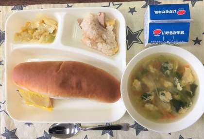 中華おこわ、卵スープ、キャベツのオイスターソースいため、アプリコットジャム、コッペパン、牛乳〔鶏卵を除去する個別対応献立〕